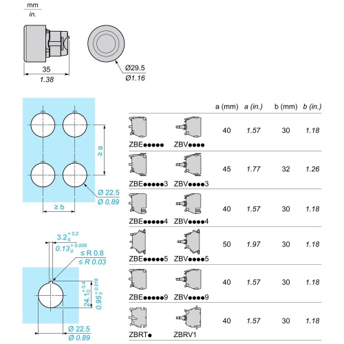Schneider ZB5AP3 Head for non-illuminated push-button CSA, LROS (Lloyds register of shipping, DNV, UL Listed, GL, RINA, BV Not compatible with legend holder Round Clear boot Dark gray plastic Green projecting, unmarked 0.87 in (22 mm 1 Harmony XB5 spring return XALK 22 mm Plasti