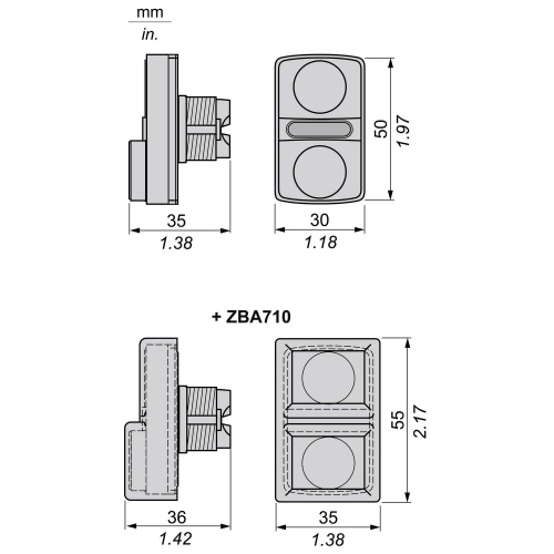 Schneider Electric ZB5AW7L3741 Illuminated double-headed push button head, plastic, Ø22, 1 green flush I + 1 pilot light + 1 red projecting O
