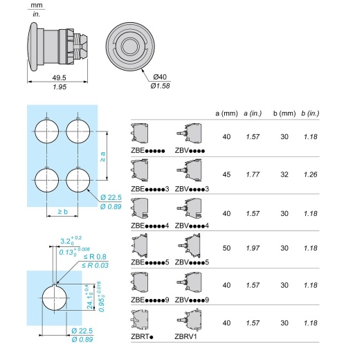 Schneider ZB5AW763 Head for illuminated push-button Turn to release UL Listed, CSA, DNV, GL, LROS (Lloyds register of shipping, RINA, BV Integral LED Round Blue Dark gray plastic Blue mushroom Ø 40 mm, unmarked 0.87 in (22 mm 1 Mushroom head Harmony XB5 latching XALK 22 mm Plast