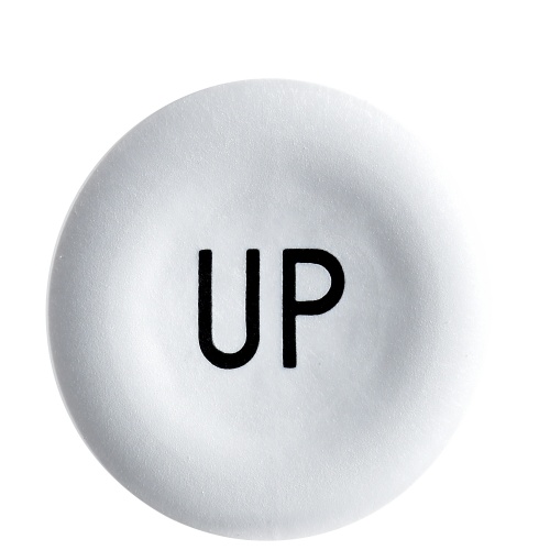 This Harmony ZB, flush white marked push button cap has a round shape with \UP\ symbol