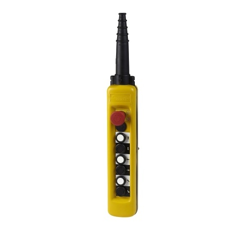 Schneider XACA67131 Polypropylene Control circuit Control of single speed hoist motor 6 push-buttons + 1 emergency stop With mechanical interlocking between pairs Pendant control station ZB2BE101 for each direction, XENT1192 for emergency stop Slow-break Harmony XAC XACA Pendant