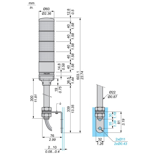 Monolithic tower light, red-orange-green-blue, 60mm, tube mounting, steady or flashing, with buzzer 70…85 dB, IP23, 24 V AC DC