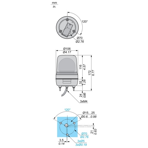 Schneider XVR10B05 Without 24 V AC/DC 4.17 in (106 mm Prewired rotating mirror beacon High luminosity LED, orange IP55 IEC 60529 with accessory, IP23 IEC 60529 4.17 in (106 mm 4.17 in (106 mm Lights/Beacons/Signaling Solutions Harmony XVR Rotating Beacon Lights Pre-wired rotating