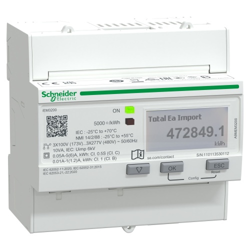 Schneider A9MEM3200 0 - 5 A, 1 A Energy meter Class 0.5S active energy IEC 62053-22, Class 0.5S active energy IEC 61557-12, Class C active energy EN 50470-3 Entry Energy Meters Acti 9 iEM3000 Series Products