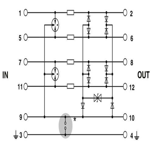 Phoenix Contact 2838775 A protective plug with high frequency (HF) protective circuit is designed to protect against electromagnetic interference and surge damage on four individual signal wires, operating at a nominal voltage of 12 volts direct current (DC).