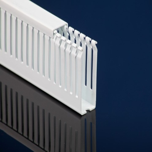 Iboco T1E1540W White Wire Duct 6' Length with Cover (1 1/2" wide X 4" deep),6' lengths. Made of rigid PVC with a UL 94V-0 flammability rating. Flush cover designed to hold 10% more wires. Standard mounting holes and wide finger design make it more rigid and larger slot width.