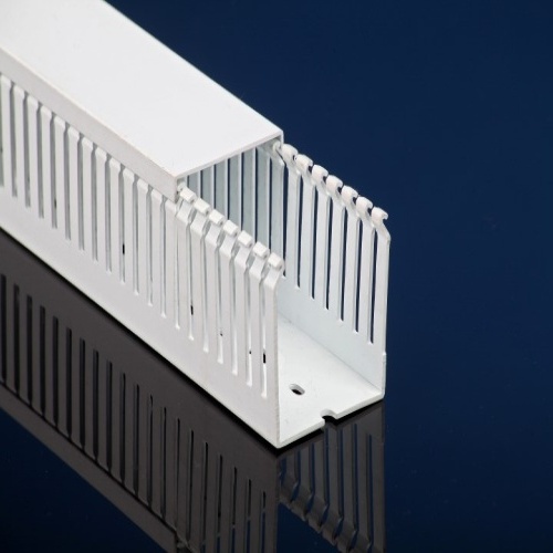 Iboco T1E2222W White Wire Duct 6' Length with Cover (2 1/4" wide X 2 1/4" deep),6' lengths. Made of rigid PVC with a UL 94V-0 flammability rating. Flush cover designed to hold 10% more wires. Standard mounting holes and wide finger design make it more rigid and larger slot width.