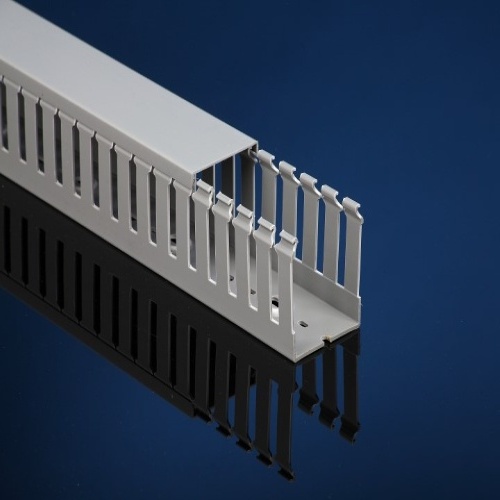 Iboco T11530G Gray Wire Duct 6' Length (Wide Finger) with Cover (1" wide X 2 1/4" deep),6' lengths. Made of rigid PVC with a UL 94V-0 flammability rating. Flush cover designed to hold 10% more wires. Standard mounting holes and wide finger design make it more rigid and larger slot width.