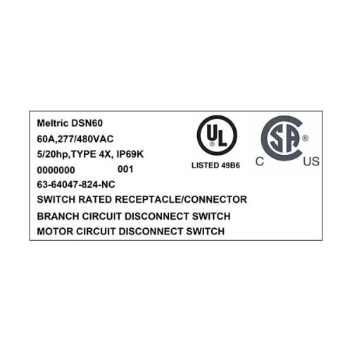 Meltric 63-64047-824-NC Switch-Rated DSN60 Receptacle 277/480 VAC 60A Size 3 3P+N+G Blue Poly IP66,IP67,IP69 Screw Terminal Metal Pawl (On Poly Receptacle) UL 498,UL 1682