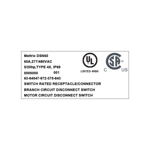 Meltric 63-64047-972-375-843 Switch-Rated DSN60 Receptacle 277/480 VAC 60A Size 3 3P+N+G Blue Poly IP66,IP67,IP69 Screw Terminal Padlockable Mushroom Pawl UL 498,UL 1682