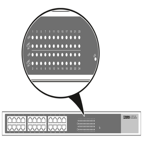 Phoenix Contact 2891057 The device features a compact design with 24 Ethernet ports on the front, all utilizing RJ45 connectors. It can automatically detect and adapt to data transmission rates of 10, 100, or 1000 Mbps, allowing it to seamlessly integrate different network segments at varying speeds. Additionally, the switch boasts an auto-crossing function, which enables efficient coupling between segments with differing transmission rates, making it suitable for installation in a standard 19-inch rack measuring 482 mm in width.