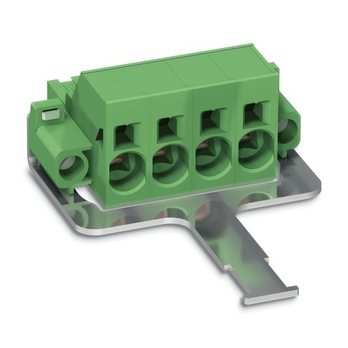Phoenix Contact 1711488 The PCB connector in question features a nominal cross-sectional area of 16 mm², with a green color and a rated voltage of 1000 V at 76 A. The contact surface material is silver, using a socket connection type with four potentials. With a pitch of 10.16 mm, this connector uses a push-in spring connection method, where the conductor meets the PCB at a 0° angle. A screw locking mechanism secures the connector without a locking clip, and it can be mounted using a screw flange. The product range includes the SPC 16/..-STF-SH, and it's packaged in cardboard.
