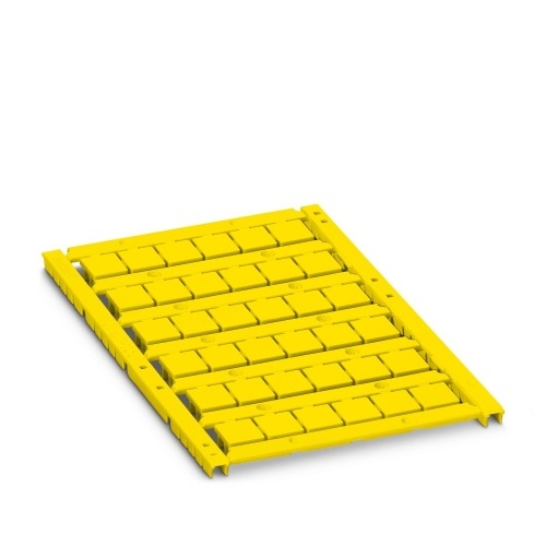 Phoenix Contact 0829143 The marker is a yellow sheet used as a label for terminal blocks and can be customized with various logos from brands including TOPMARK, BLUEMARK, and THERMOMARK, offering multiple mounting types and options to accommodate different widths of terminals, featuring a total of 36 individual labels per sheet.
