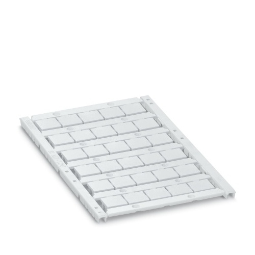 Phoenix Contact 0829144 A marker for terminal blocks comes in a white, unlabeled sheet that can be customized with various labels such as TOPMARK NEO or BLUEMARK ID COLOR. The label options include different color schemes and sizes to accommodate various needs. The mounting type is latching, designed to fit terminal blocks with a width of 12 mm. Each sheet contains individual labels for writing, with a total of 30 labels available across fields that measure 9.6 mm in height and 10.8 mm in width.