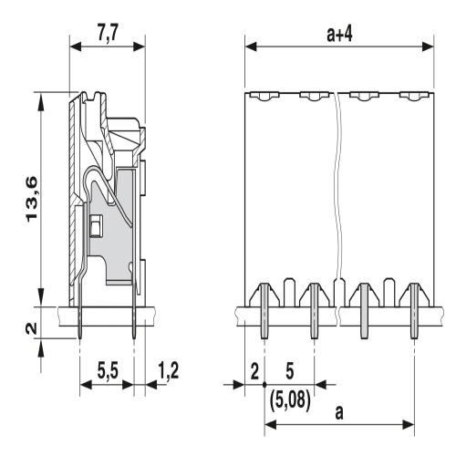 Phoenix Contact 1823573 A printed circuit board terminal features a nominal current of 17.5 A and is rated for a voltage of 320 V, with a cross-sectional area of 1.5 mm² and seven potentials. The terminal's dimensions include one row with seven positions, each measuring 5.08 mm apart, utilizing push-in spring connections for attachment via either THR soldering or wave soldering methods.