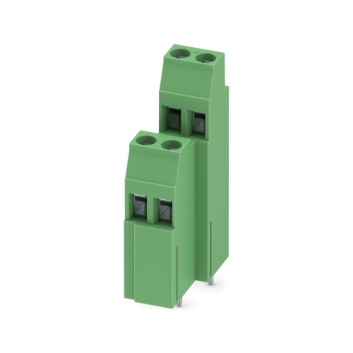 Phoenix Contact 1723205 A printed circuit board terminal features a nominal current of 22 A and is rated for 400 V, with a cross-sectional area of 2.5 mm². It has four potentials and is configured into two rows, each containing two positions, as part of the MK3DSMH 3 product range with a pitch of 5.08 mm. Connections are made via screw attachment with a tension sleeve using an L-slotted screw head, suitable for wave soldering. The terminal's color is green, and it employs linear pinning, while individual pins are spaced 5mm apart, with one solder pin per potential. This product can be packaged in cardboard, accommodating various configurations through alignment.