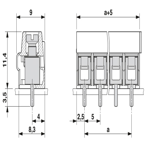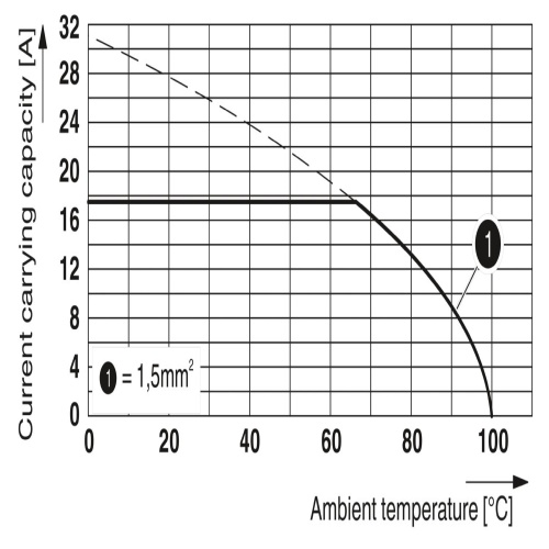 Phoenix Contact 1935297 A printed circuit board terminal has a nominal current rating of 17.5 A and is rated for a maximum voltage of 400 V. It features a cross-sectional area of 1.5 mm² and is designed to accommodate 15 different potentials, with a linear pin layout and 15 positions per row on a single row. The product range includes PT 1,5/..-H models, with a pitch of 5 mm and screw connections secured by wire protectors. Wave soldering is used for mounting, and the conductor meets the PCB at a 0° angle, while the terminals are colored green, making it an ideal component for various applications.