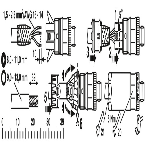 Phoenix Contact 1080235 A power connector featuring a 5-position, shielded plug with a straight M12 configuration has a push-lock spring connection and is made from brass with a nickel-plating, having an external cable diameter that ranges between 8 millimeters and 13 millimeters.