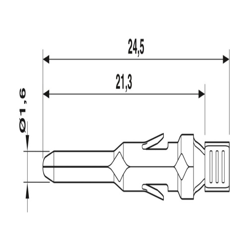 Phoenix Contact 1004360 The crimp contact specifications include a diameter of 1.6 mm with a rolled pin configuration and a contact material made of copper alloy nickel-plated on the surface, while the connection cross-section measures 0.34 mm², falling within the range of 1-2 square millimeters for American Wire Gauge (AWG) 22 and below AWG 17.