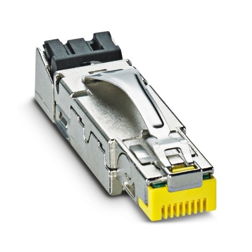 Phoenix Contact 1149847 An RJ45 connector with a design that meets the IP20 degree of protection standard features eight positions for use. It is capable of supporting 10 Gbps speeds and utilizes CAT6A cabling, which is made from metal materials. The connection method employs insulation displacement connections, allowing for AWG 23-22 cable cross-sections to be securely attached through a straight outlet with a yellow color, ultimately establishing an Ethernet connection.