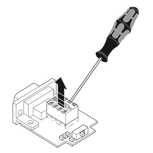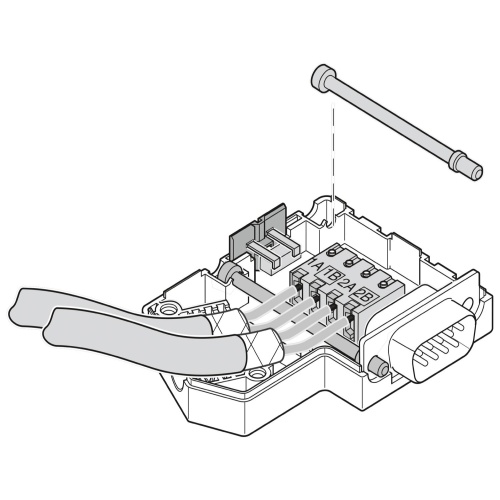 Phoenix Contact 2744348 The D-SUB plug is a 9-position axial version with two 35° cable entries and operates within the PROFIBUS DP bus system at speeds up to 12 Mbps. The termination resistor can be turned on or off using a slide switch, and the pin assignment consists of 3, 5, 6, and 8, while terminal blocks for spring-cage connections are also provided.