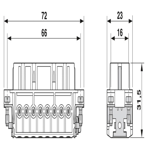 Phoenix Contact 1585346 The product specifications include a contact insert with varying numbers of positions, accommodating up to 16 poles (PE), and comes in two sizes: D25 and another size that is not specified. It features a socket connection, secured by a screw, and has a rated voltage of 250 V, with a maximum current capacity of 16 A and copper conductors of either 0.5 mm2 or 2.5 mm2.