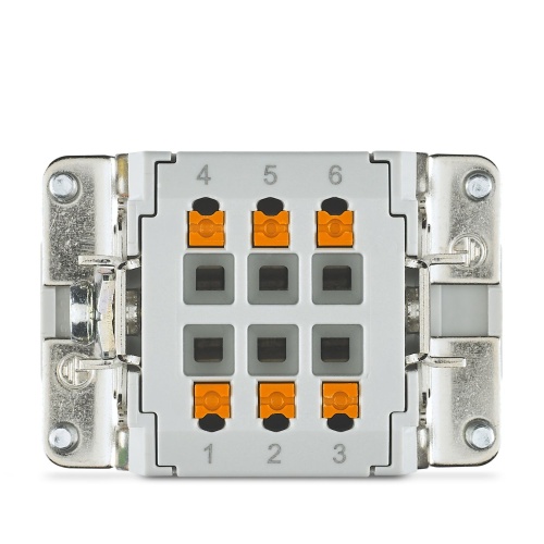 Phoenix Contact 1407727 A contact insert with various specifications is available for purchase, suitable for electrical power applications. The contact has six or more positions (6+PE), a size of B6, and each position features a single push-in connection that can handle up to 16 amps at 500 volts, with cross-sectional areas ranging from 0.14 mm² to 2.5 mm².
