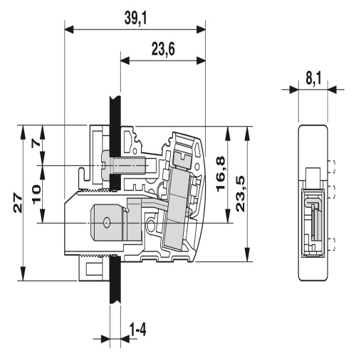 Phoenix Contact 3056996 A panel feed-through terminal block features a screw connection with tension sleeve and spade connections, accommodating one position. It's designed to handle load currents up to 18 A and comes in various cross-sectional sizes from 0.2 mm2-6 mm2. The connection direction of the conductor aligns with the plug-in direction at 0 ° angle, measuring a width of 8.1 mm and boasting a gray color.