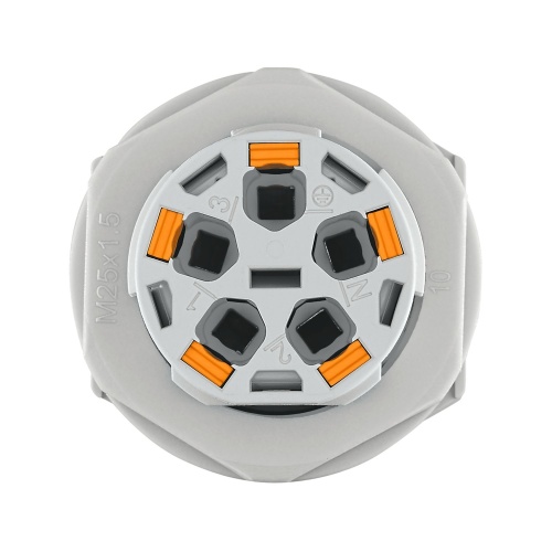 Phoenix Contact 1047344 The product features a panel feed-through with options for direct connection through push-in connections in various sizes, including 4+PE, M25, and from 0.5 mm² to 2.5 mm². It is rated for 600 volts and 20 amps, falls under the PA category, has an external cable diameter of 7-16mm, and is available in light gray with a matching push-in connection system.