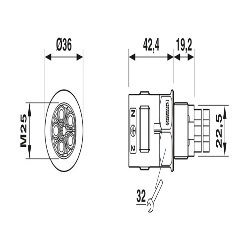 Phoenix Contact 1410396 The QUICKON panel feed-through has four or more PE-pos and is available in two different current ratings: 2.5mm² to 6.0mm²/690V/40A, without a quick-release nut, featuring a black M25 connection thread with five welded-on cable wires measuring 0.5m long, cut flat at the end.