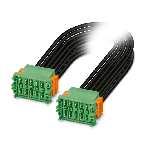 Phoenix Contact 1084529 This connector assembly consists of a connecting cable with two PCB connectors, rated for an current flow of up to 8 amps and featuring a flexible cable length ranging from 0.1 to 3 meters. The head unit includes five positions, spaced 3.5mm apart, utilizing crimp connections and colored black, with individual litz wire cable types consisting of PVC insulated conductors in 20 AWG gauge, 18 AWG for the secondary connector.