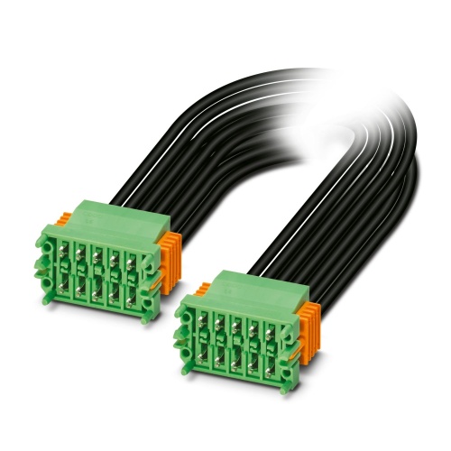 Phoenix Contact 1084527 A connector assembly consisting of two PCB connectors connected to a single connecting cable is described. The cable has a maximum rated current of 8 A and a length range of free input between 0.1 and 3.0 meters. It features two heads with two-position switches and a pitch of 3.5 mm, secured via crimp connections. The cable itself consists of individual litz wire, PVC insulation, and is available in 20 AWG black (head 1) and 18 AWG black (head 2).