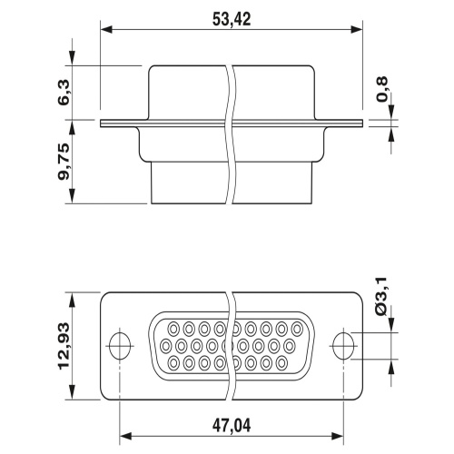 Phoenix Contact 1655247 A D-SUB contact carrier with a shell size 3 accommodates 44 signal contacts and features a straight contact socket suitable for crimp connections, secured by a 3 mm hole allowing for panel mounting frame and sleeve housing of type VS-25-.