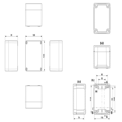 Phoenix Contact 0899348 The empty enclosure is made from a polyester-fiberglass composite material with a gray color matching RAL 7000. Its dimensions are 120mm in width, 122mm in length, and 91mm in height, featuring a screw-on cover for secure closure.
