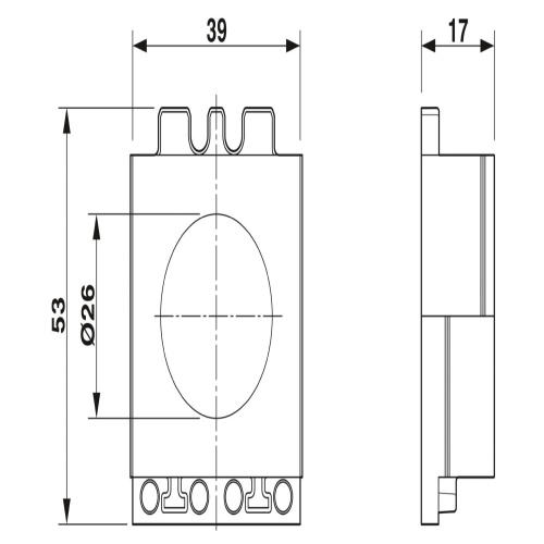 Phoenix Contact 0801643 A large round cable with a single conductor features a black rubber (NBR) outer cover, measuring between 25-26mm in diameter, has a slotted design, and is 53mm long with a width of 39mm and a height of 17mm.