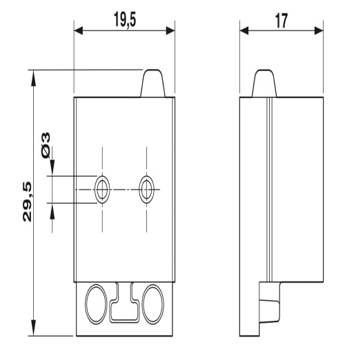 Phoenix Contact 1410424 A small round cable with a slotted exterior features a diameter ranging from 2x 2.4 mm to 2.7 mm, made of halogen-free SEBS material and measuring 29.5 mm in length, 19.5 mm in width, and 17 mm in height, also having a gray color and accommodating two conductors.