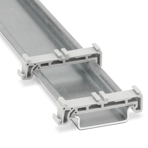 Phoenix Contact 1049498 A DIN rail adapter designed specifically for use with NS 35 connectors is available, featuring a unique configuration that allows it to accommodate two 1.5mm² FIX blocks in the horizontal position and has a gray colour scheme.