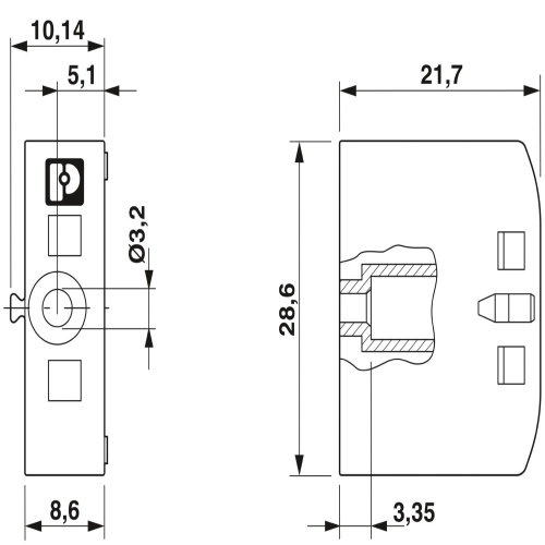 Phoenix Contact 3274060 The flange is designed with screw fixing for direct attachment to the 2.5mm² and 4mm² FIX blocks, measuring 21.7mm in depth, 8.6mm in width, and 28.6mm in height, featuring a gray color and utilizing screw mounting.