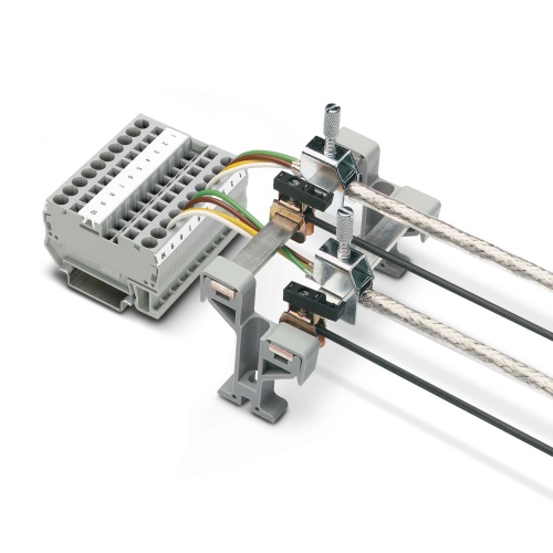 Phoenix Contact 3026890 A terminal block designed specifically for creating direct shield connections on conductive mounting panels with sheet thickness ranging from 1 millimeter to 2 millimeters.