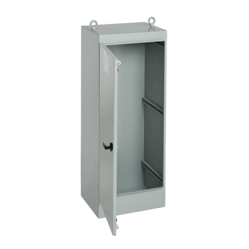 nVent Hoffman A723024FSG Steel Enclosure Freestanding Steel Enclosure Type 12 for indoor use have sturdy unibody construction. Concealed easy to remove hinges and 3-point latch system with keylocking handle, and door with bonding provsions, stay in place gasket and includes data pocket. Internal mounting channels welded horizontally to sides at top, bottom and center,rack mount angles can be mounted anywhere along channels. Studs to add backplates for mounting equipment. Stiffiners on back fo two door models to to maintain flatness and increase rigidity.