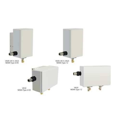 NEMA Type 12 models are polycarbonate and aluminum exterior, aluminum and brass internal components