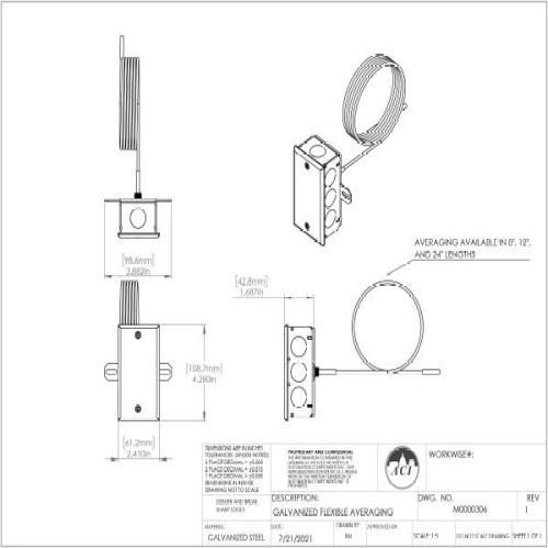 The ACI Thermistor Flexible Averaging Series features an 18 AWG Plenum Rated cable sensing element with two, 12” 22 AWG Etched Teflon colored lead wires to differentiate the sensor types. The sensors in this series are multi-point. Averaging sensors provide a better overall average temperature of the actual air inside larger ducts when compared to that of a single point sensor. All flexible averaging sensors are limited to being used in applications where operating temperatures are limited and high humidity, chemical resistance, and UV light sources aren’t required. Each of the sensing elements is protected using a dual wall adhesive lined heat shrink tubing to provide a basic level of moisture protection. The sensor length should be determined by the size of your duct. Standard enclosure options include a galvanized junction box “-GD” or plastic duct enclosure with hinged cover “-PB”. Each unit includes nylon wire ties and mounts for mounting. Optional copper capillary or universal plastic mounting clips, NEMA/IP Weather proof enclosures and NIST Certificates are available as referenced in the ordering grid on the back of the product data sheet. Applications: Air Handlers, Roof Top Units, Mixed Air/Discharge/Supply Air Temperature Monitoring, Data Centers, Hospitals