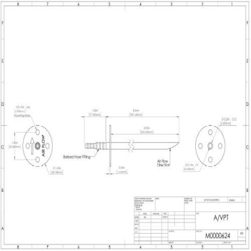 The VPT Series is an Aluminum Velocity Pressure or flow (Impact) probe used to sample the air flow in HVAC duct or equipment applications. The VPT should be mounted approximately 5 to 8 duct diameters downstream from elbows, obstructions, or large change in duct area to reduce the amount of turbulence that will affect your readings.