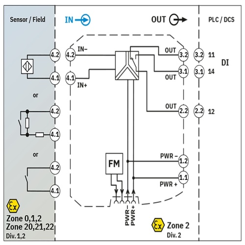 Phoenix Contact 2924045 The ExiNAMUR isolation amplifier is designed for use in hazardous areas where proximity sensors and switches operate; it transfers signals through a changeover contact on the relay output to a safe zone. This system incorporates line fault detection, three-way isolation, and achieves a SIL rating of 2.