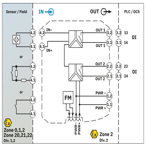 Phoenix Contact 2865450 The Ex i NAMUR isolating amplifier is designed for use in hazardous areas near proximity sensors and switches requiring Ex certification. It safely routes signals through two N/O relay outputs into a non-hazardous zone where they can be monitored without risking exposure to explosive atmospheres. Additionally, this device features line fault detection and 3-way isolation, as well as SIL 2 compliance for enhanced safety in applications involving potentially hazardous environments.