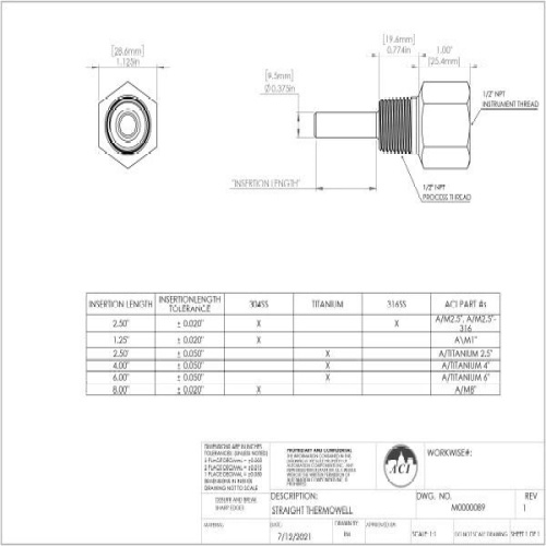 The ACI Thermistor Immersion Series features a ¼” diameter stainless steel probe with two, 14” 22 AWG Etched Teflon colored lead wires depending on the probe length ordered to differentiate the sensor types. The sensors in this series are manufactured using ACI’s proven double encapsulation process to eliminate the effects of moisture and to increase the response times using our high quality, thermally conductive epoxy. Optional NEMA/IP rated enclosures and NIST certificates are available the back of the product data sheet. ACI’s Machined Thermowells are used with temperature instruments in process systems where gas or liquid medias are used to provide a degree of protection for the sensing element when installed inside of a pipe, tank, or piece of equipment. The thermowell provides easy access for NIST Certified applications and enables users to easily replace the sensor without having to drain the entire system. Thermowells also protect the small diameter sensing probes from stresses created by high temperatures and pressures, corrosive environments, or the flow of gas or liquid medias through pipes or equipment. It is recommended to follow a Wake Frequency calculator using the ASME PTC 19.3 TW-2016 standard to help prevent vibrational destruction from damaging the thermowell. ACI’s standard thermowells are made of 304 stainless steel which ensures long lasting reliability and corrosion resistance. Optional 316 Stainless Steel is available for use in applications where higher corrosion resistance is required. This series is machined from solid bar stock to precision tolerances which provides maximum heat transfer when used with a corresponding ACI sensor. When necessary, thermal grease is available from ACI to improve the sensor’s response time. Insertion depth should be long enough to permit the entire temperature-sensitive section of the temperature probe to project into the medium being monitored, thus maximizing measurement accuracy.