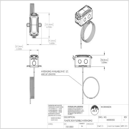 The ACI Thermistor Flexible Averaging Series features an 18 AWG Plenum Rated cable sensing element with two, 12” 22 AWG Etched Teflon colored lead wires to differentiate the sensor types. The sensors in this series are multi-point. Averaging sensors provide a better overall average temperature of the actual air inside larger ducts when compared to that of a single point sensor. All flexible averaging sensors are limited to being used in applications where operating temperatures are limited and high humidity, chemical resistance, and UV light sources aren’t required. Each of the sensing elements is protected using a dual wall adhesive lined heat shrink tubing to provide a basic level of moisture protection. The sensor length should be determined by the size of your duct. Standard enclosure options include a galvanized junction box “-GD” or plastic duct enclosure with hinged cover “-PB”. Each unit includes nylon wire ties and mounts for mounting. Optional copper capillary or universal plastic mounting clips, NEMA/IP Weather proof enclosures and NIST Certificates are available as referenced in the ordering grid on the back of the product data sheet. Applications: Air Handlers, Roof Top Units, Mixed Air/Discharge/Supply Air Temperature Monitoring, Data Centers, Hospitals
