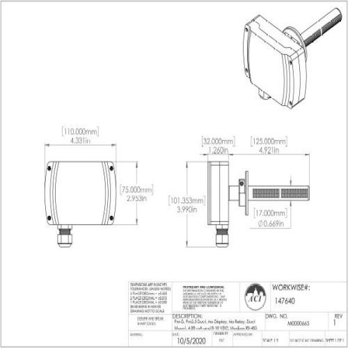 ACI 147640 PM2.5, Duct Mount, 0-500u g/m3, 4-20 mA and 0-10 VDC, Modbus RS-485