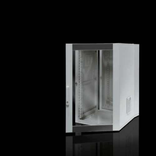 Supply Includes: Wall section with solid gland plate at the top and brush strip at the bottom, two vertical mounting rails and C rail, horizontal, for cable clamping Hinged part with 25 mm pitch pattern of holes in the front and rear frame, two 482.6 mm (19") mounting angles at the front, infinitely depth-variable, and side outlet filters on the left and right Earth rail with star earthing Designer glazed door 1 double-kit key no. 5 Wall mounting bracket, 10 mm Mini-comfort handle for lock inserts Security lock 3524 E