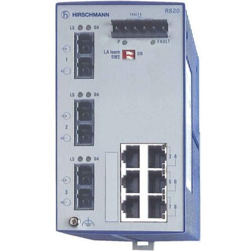 Hirschmann 943434059 RS20-0900MMM2TDAU Unmanaged Industrial ETHERNET Rail Switch with store and forward switching. Includes 6 RJ45 copper ports with auto-crossing, auto-polarity and auto-negotiation and 3 Fast (10/100) SC Fiber ports Multimode. Operating Temperature of -40F-158. Operating Voltage of 24 V DC redundant. Approvals CE, cUL508, ISA12.12.01, Class 1 Div 2.